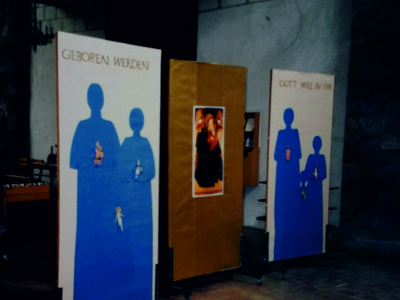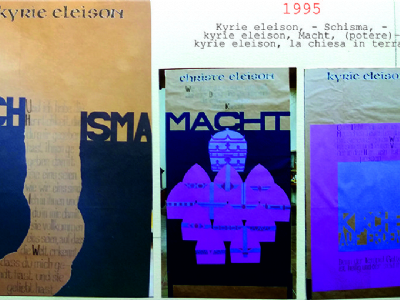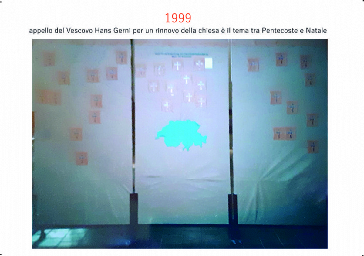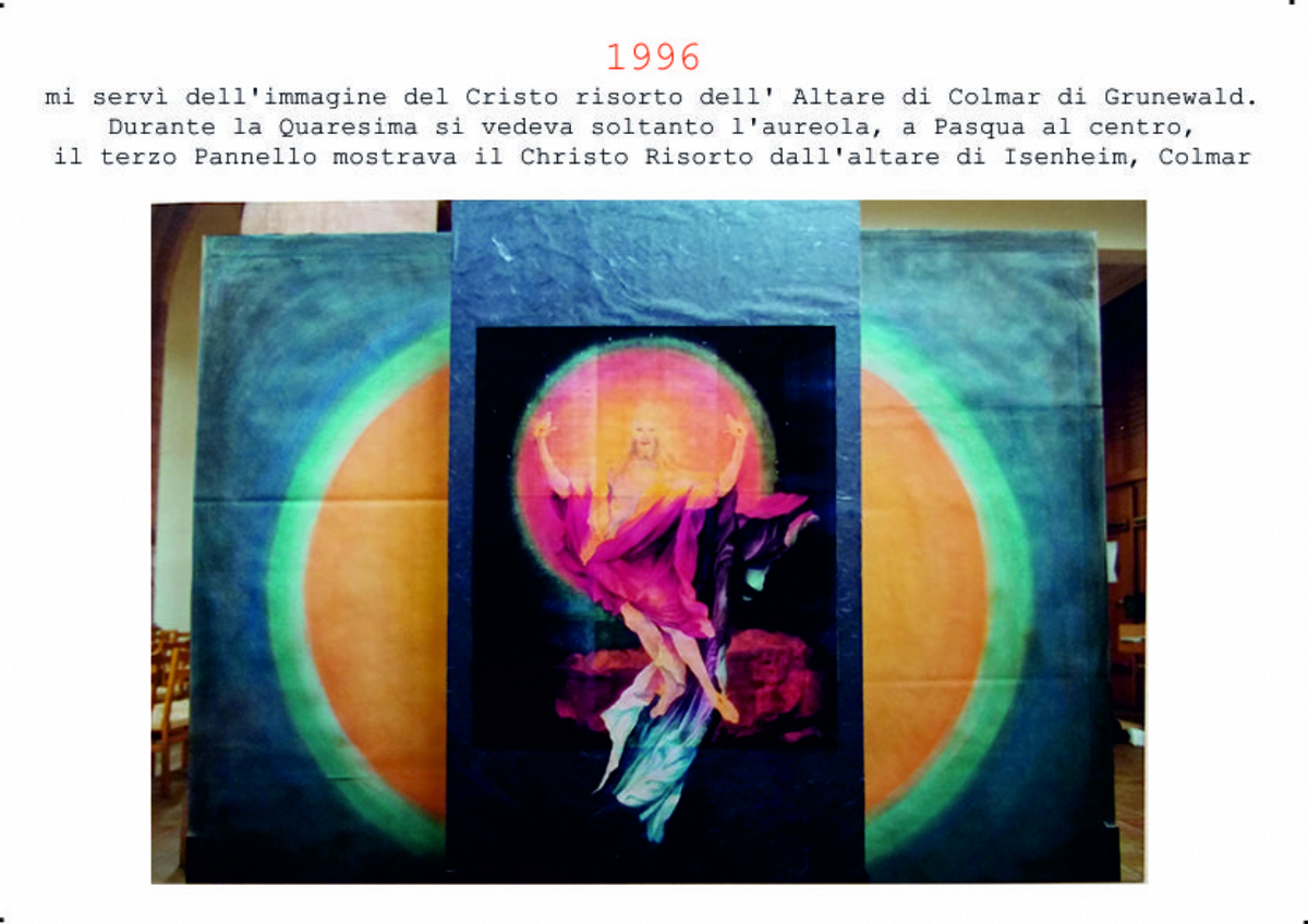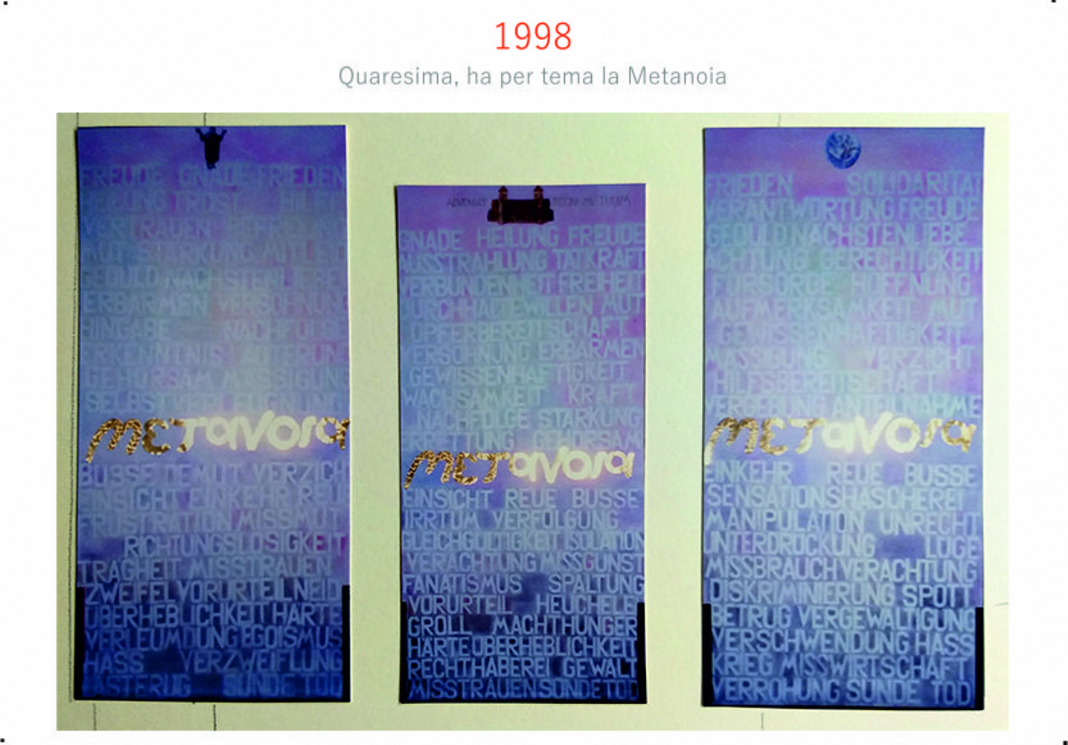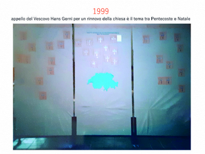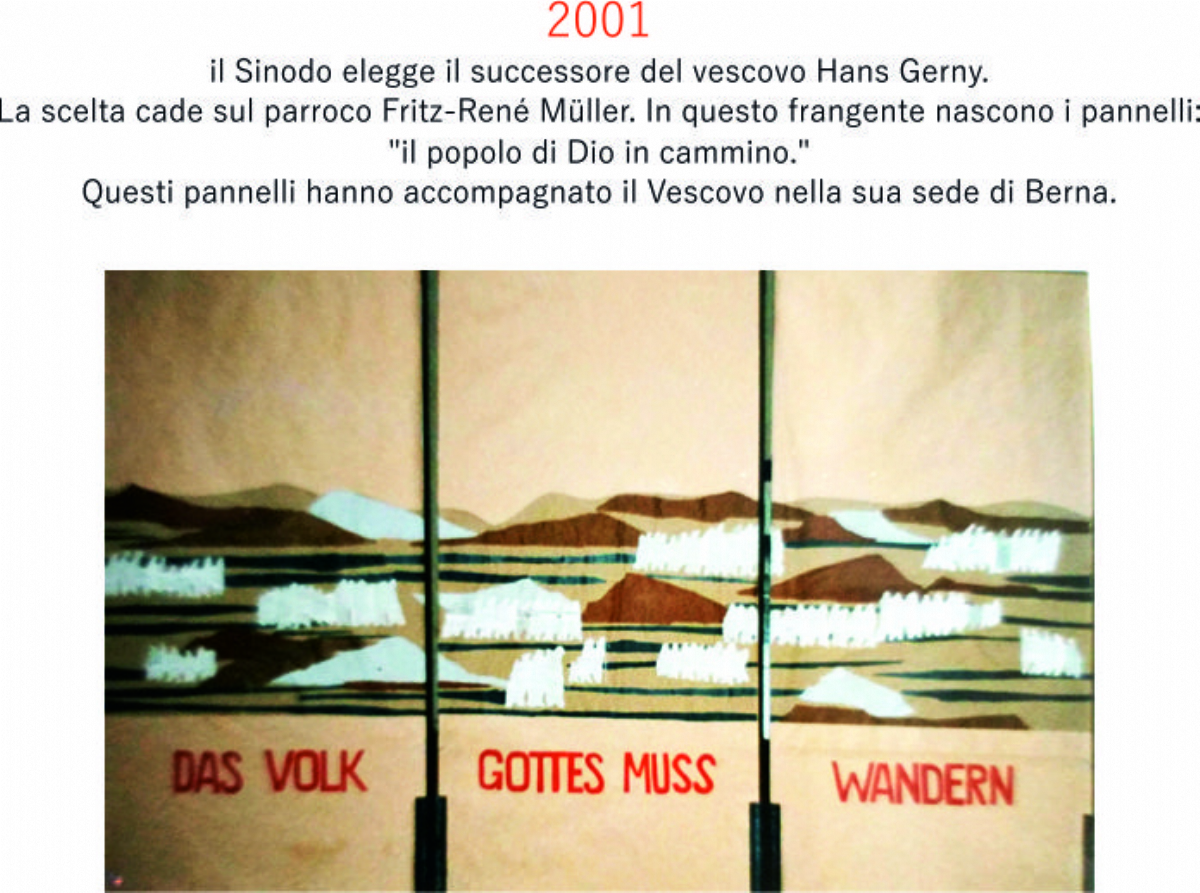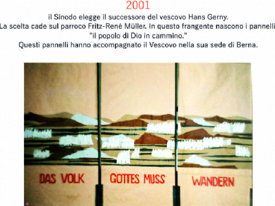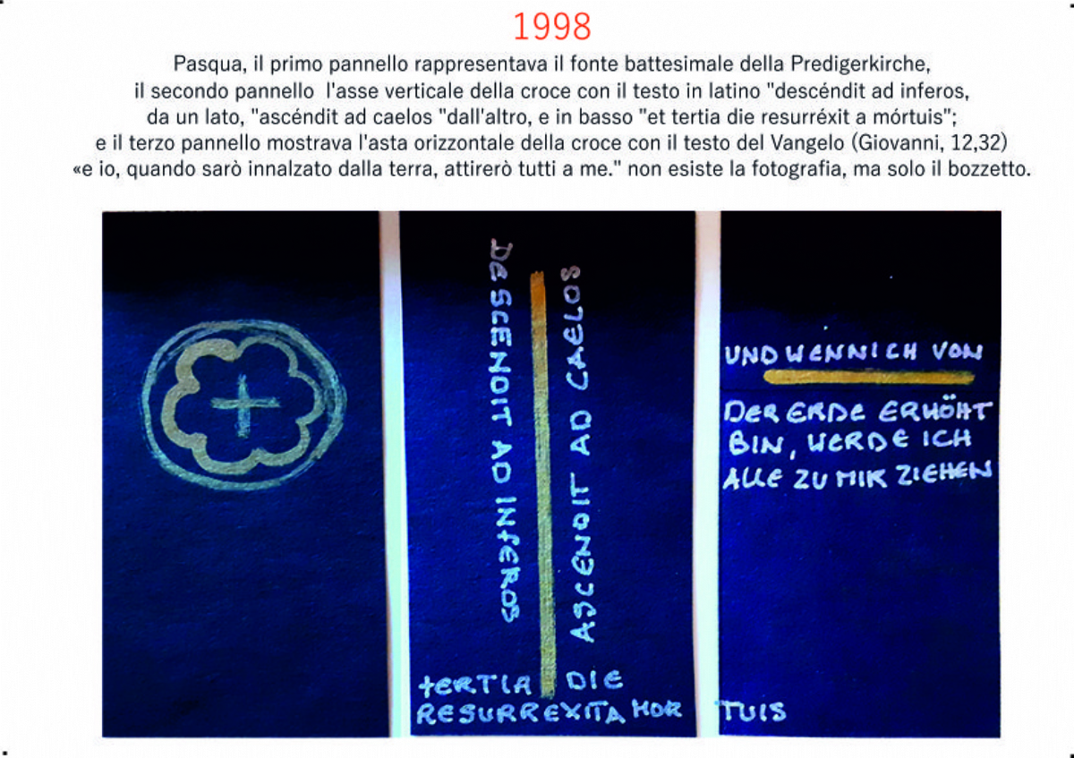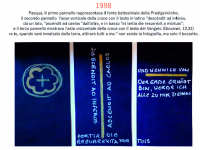 Accompagnai un gruppo di amici del nostro parroco di Basilea attraverso la Sicilia, e, al ritorno, sul traghetto che porta da Messina a San Giovanni, Fritz-René Müller mi chiese se volevo occuparmi dei tre grandi pannelli che erano posizionati all'ingresso della Predigerkirche. Originariamente erano destinati ad accogliere gli annunci, ma spesso erano abbandonati. Mi promise di darmi una mano, di indicarmi la tematica. Dopo un poco di tentennamenti mi lanciai in questa impresa,e per diversi anni, fino al momento quando Fritz-René Müller diventò vescovo, assolvevo questo compito con entusiasmo.