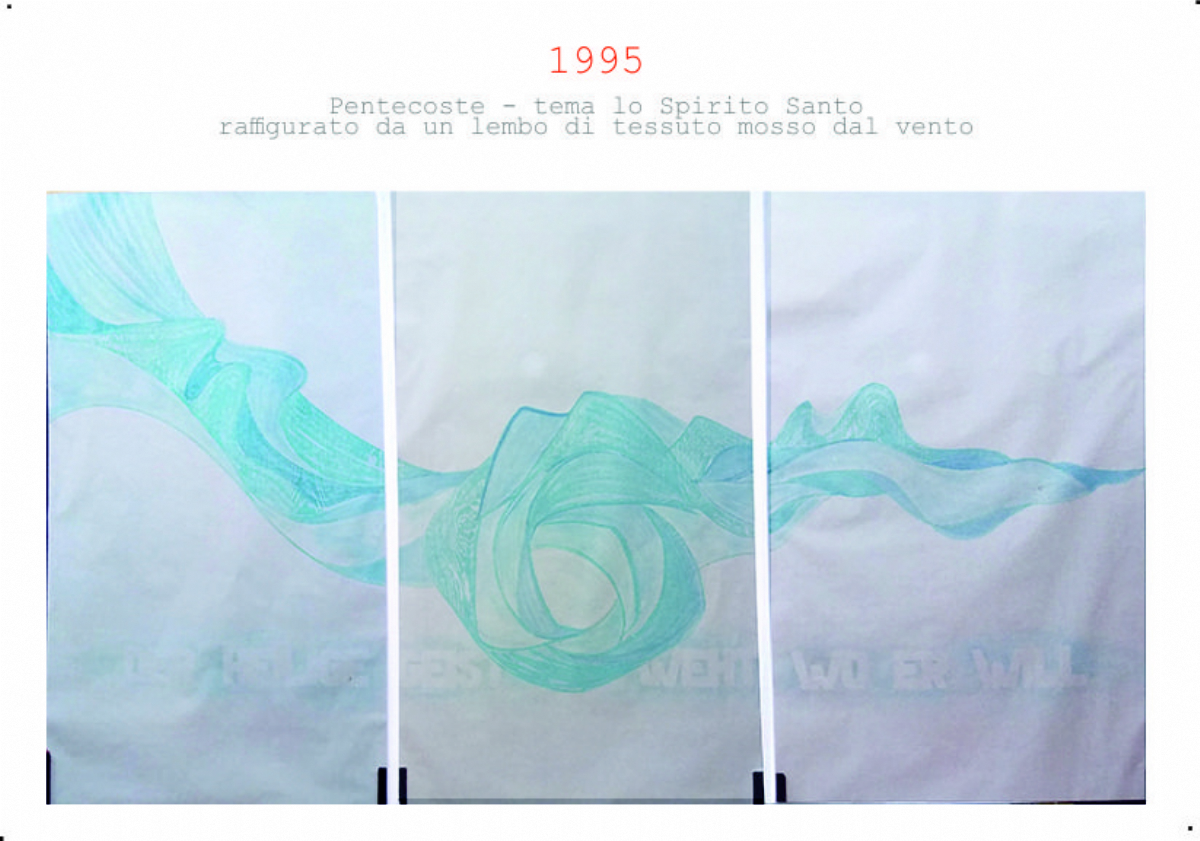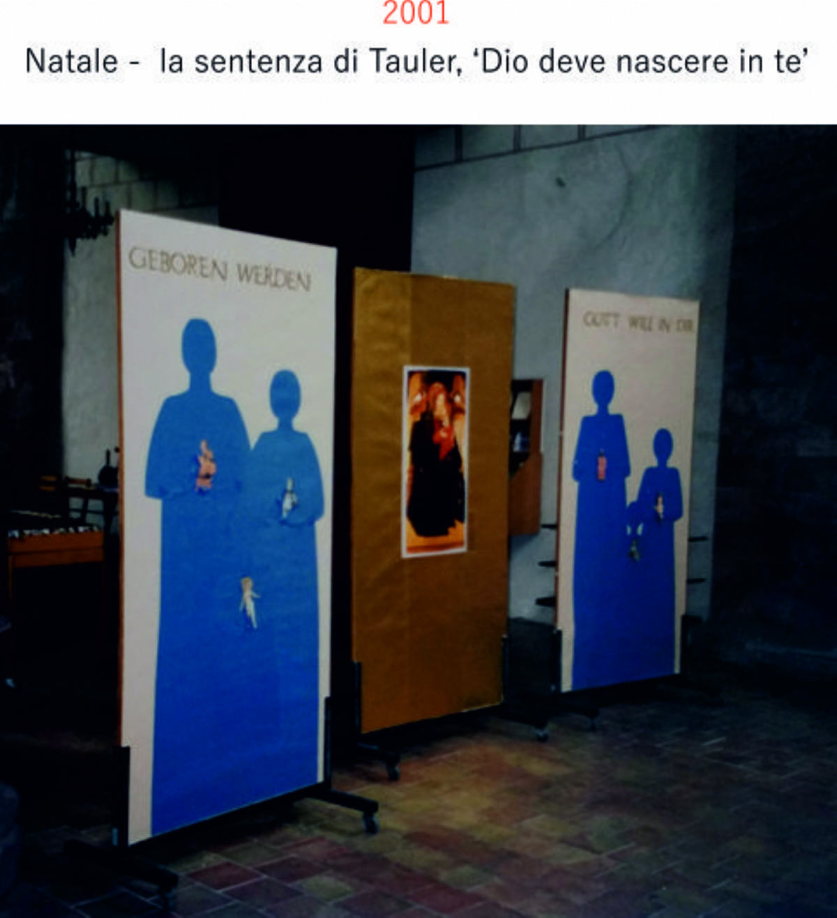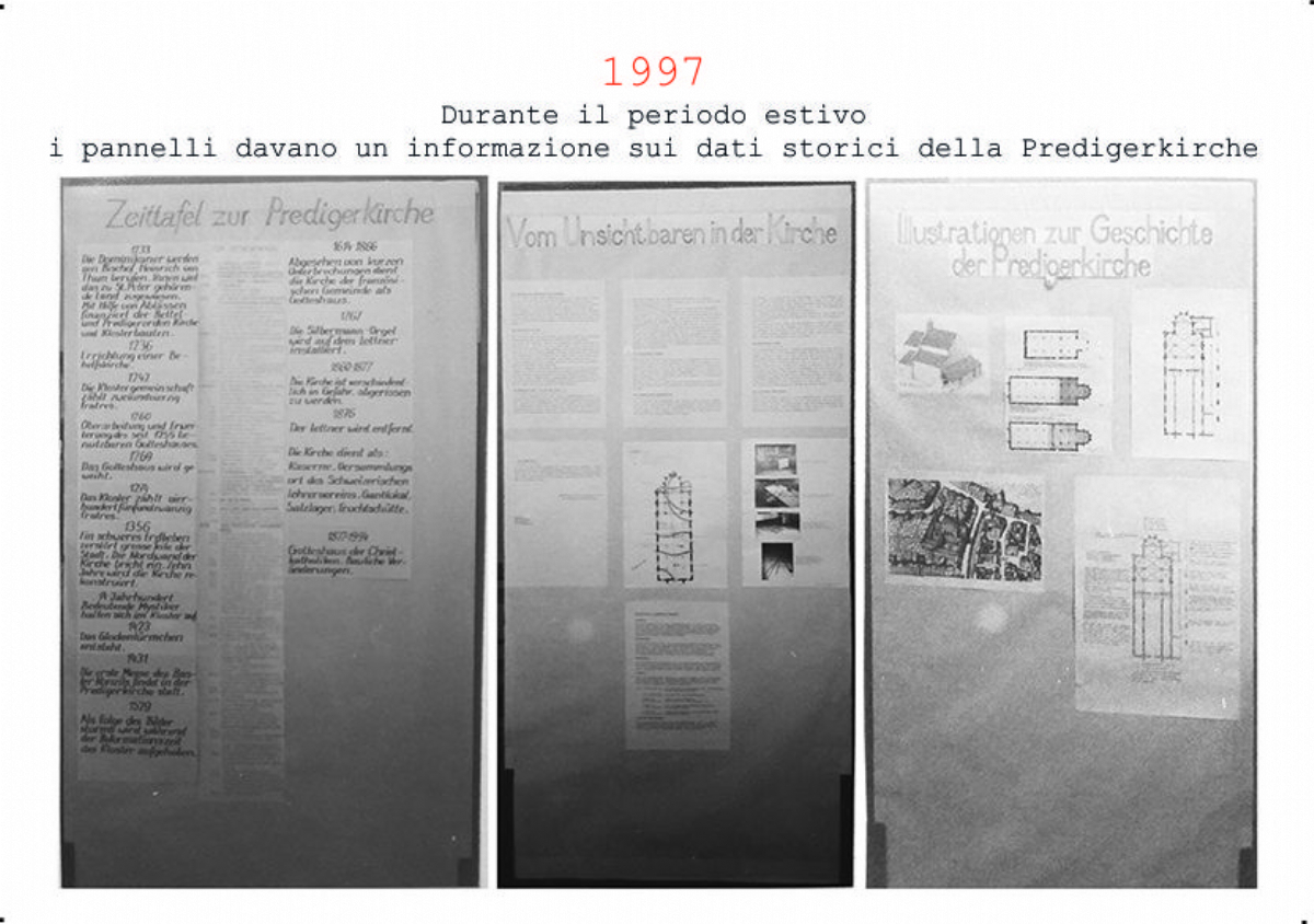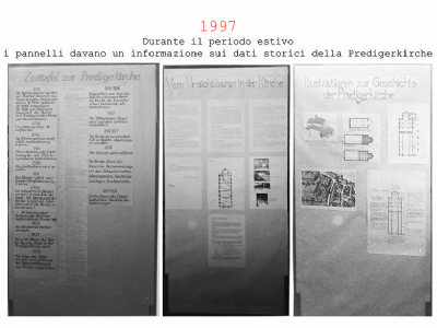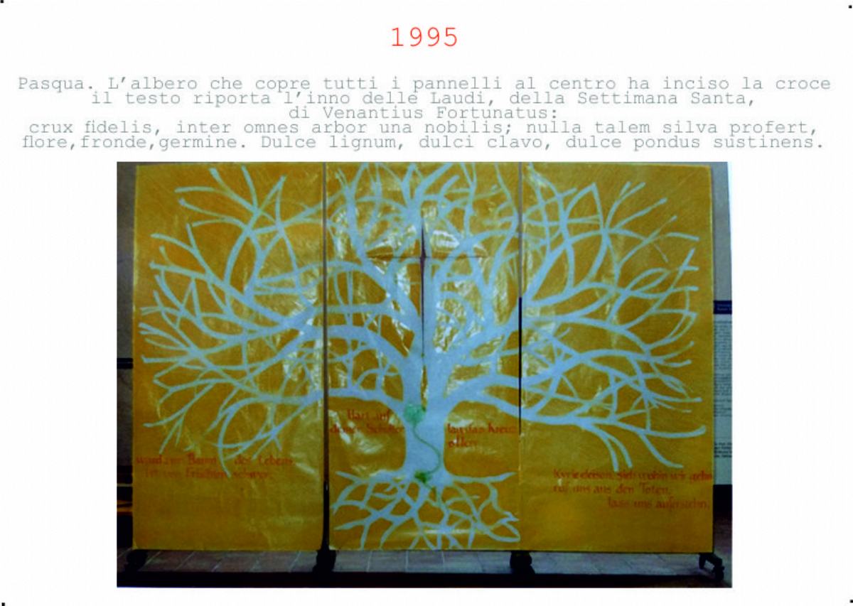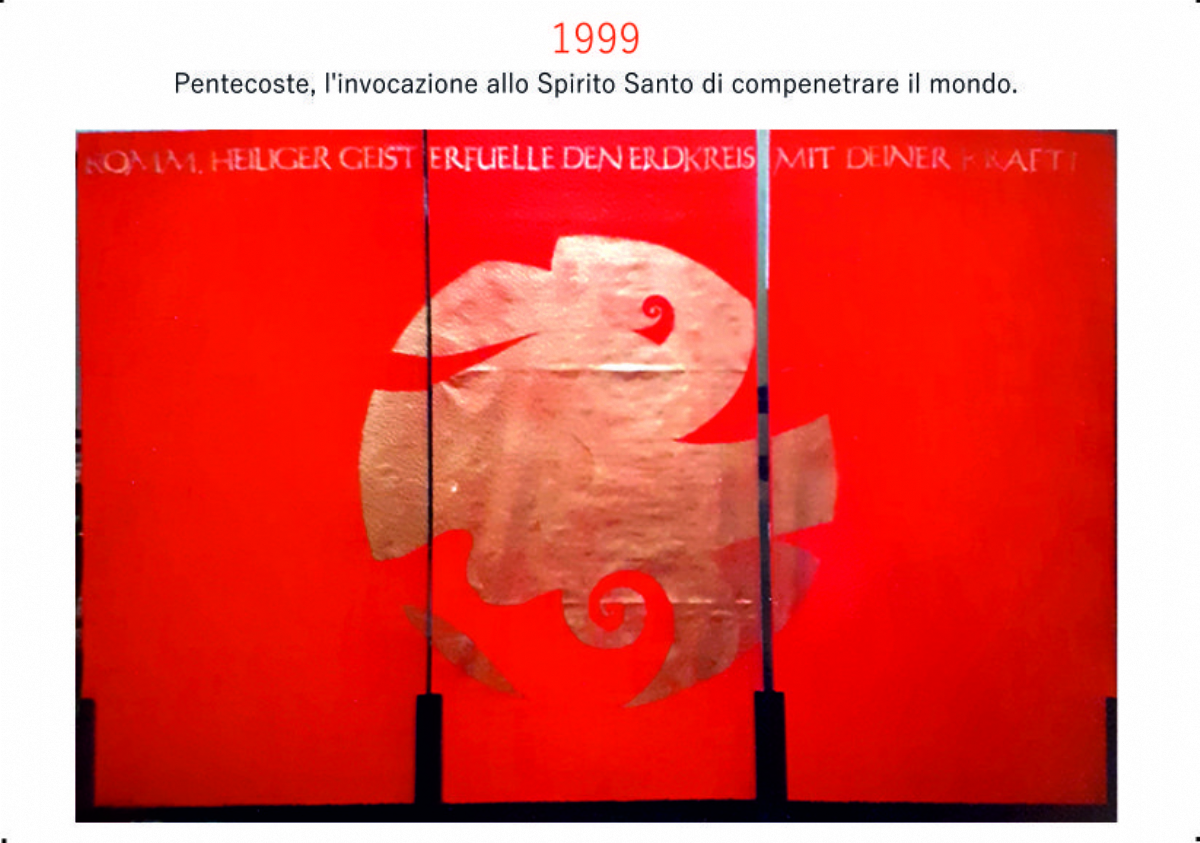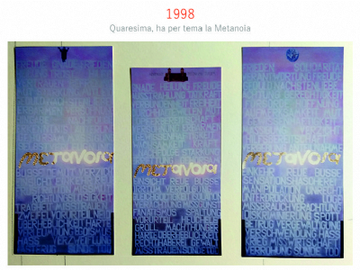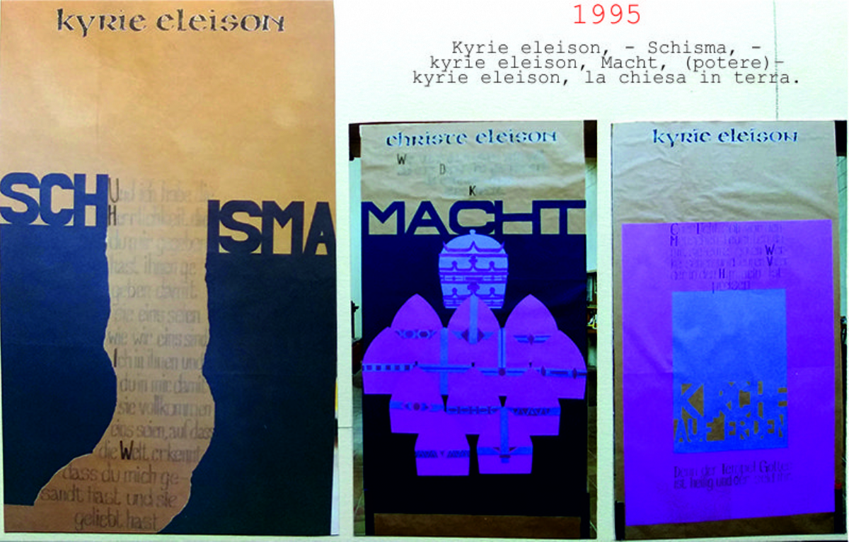 Accompagnai un gruppo di amici del nostro parroco di Basilea attraverso la Sicilia, e, al ritorno, sul traghetto che porta da Messina a San Giovanni, Fritz-René Müller mi chiese se volevo occuparmi dei tre grandi pannelli che erano posizionati all'ingresso della Predigerkirche. Originariamente erano destinati ad accogliere gli annunci, ma spesso erano abbandonati. Mi promise di darmi una mano, di indicarmi la tematica. Dopo un poco di tentennamenti mi lanciai in questa impresa,e per diversi anni, fino al momento quando Fritz-René Müller diventò vescovo, assolvevo questo compito con entusiasmo.