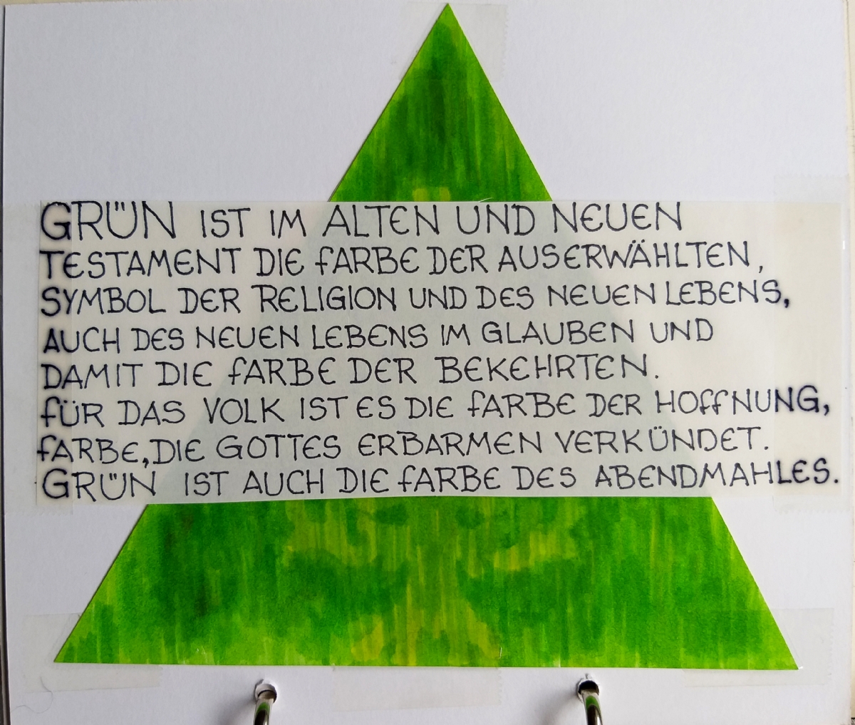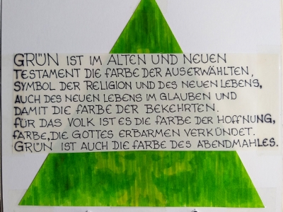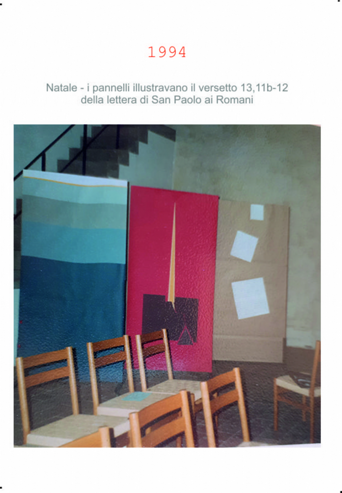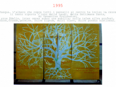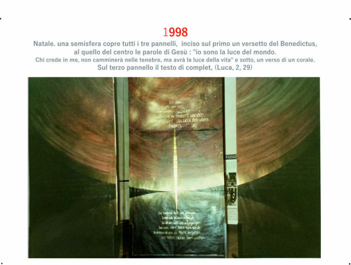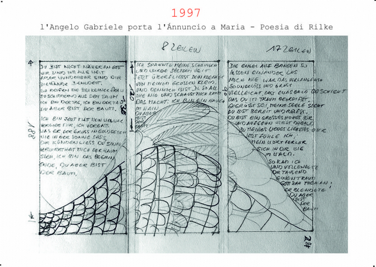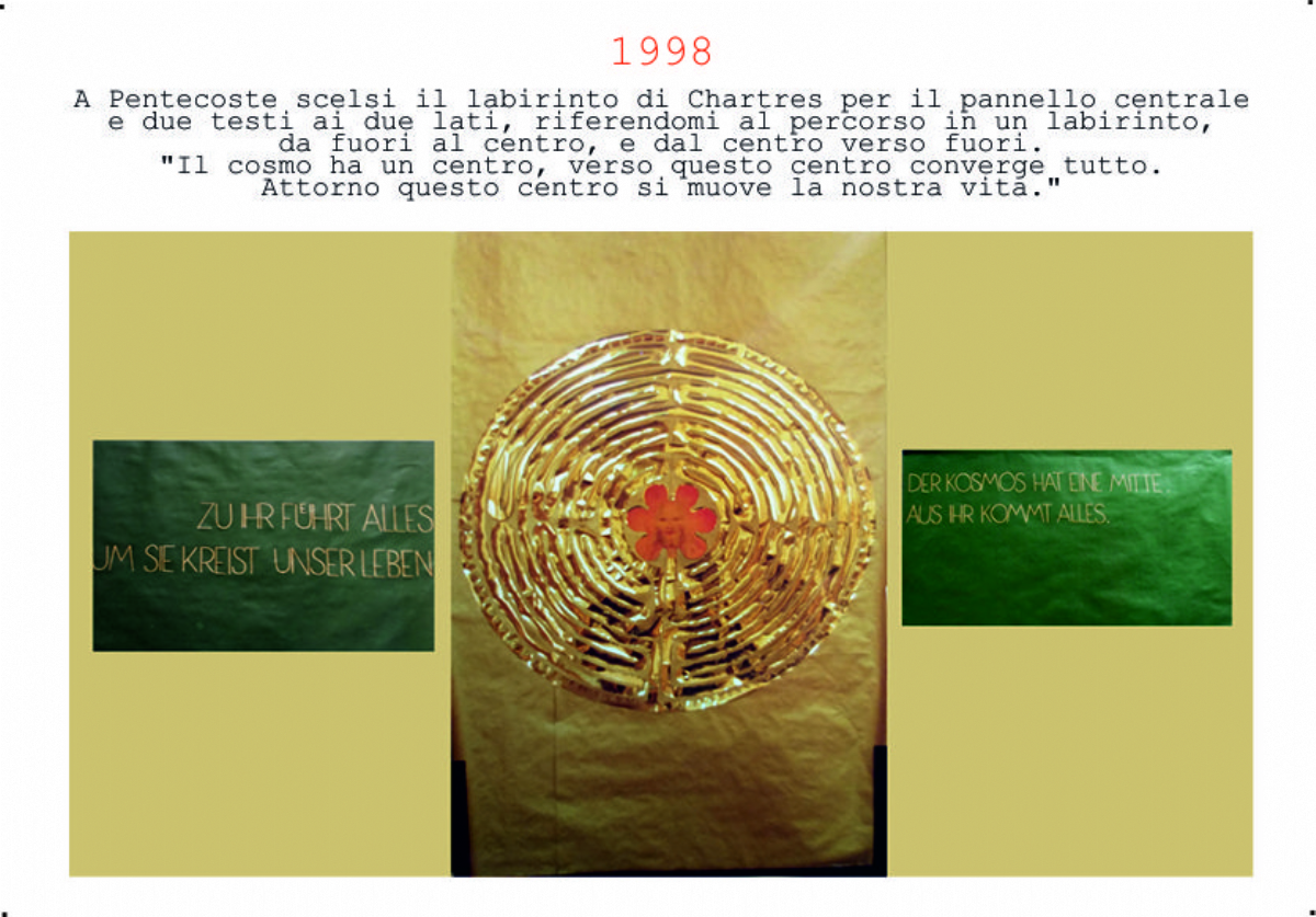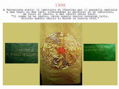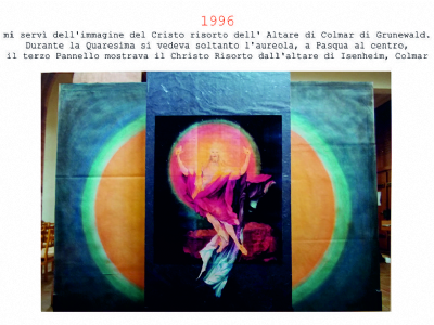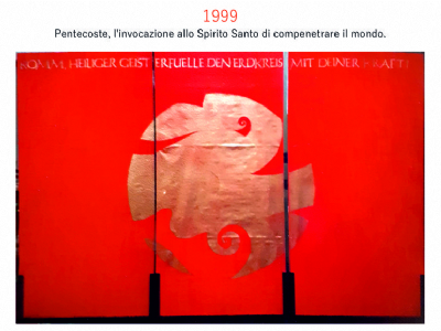 Accompagnai un gruppo di amici del nostro parroco di Basilea attraverso la Sicilia, e, al ritorno, sul traghetto che porta da Messina a San Giovanni, Fritz-René Müller mi chiese se volevo occuparmi dei tre grandi pannelli che erano posizionati all'ingresso della Predigerkirche. Originariamente erano destinati ad accogliere gli annunci, ma spesso erano abbandonati. Mi promise di darmi una mano, di indicarmi la tematica. Dopo un poco di tentennamenti mi lanciai in questa impresa,e per diversi anni, fino al momento quando Fritz-René Müller diventò vescovo, assolvevo questo compito con entusiasmo.