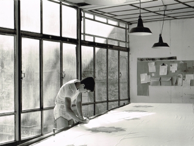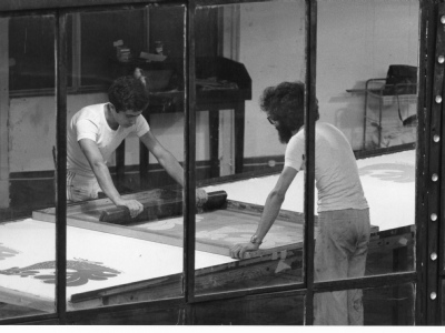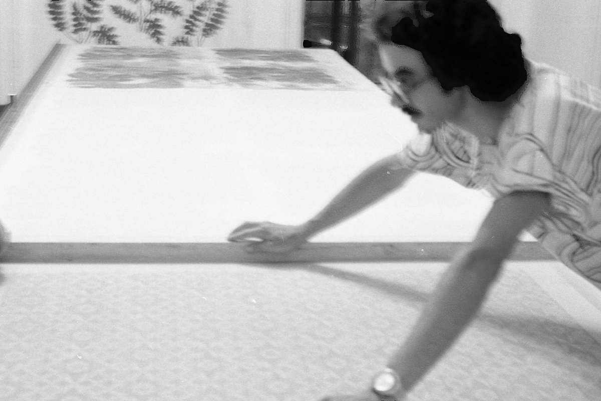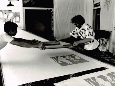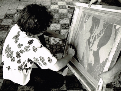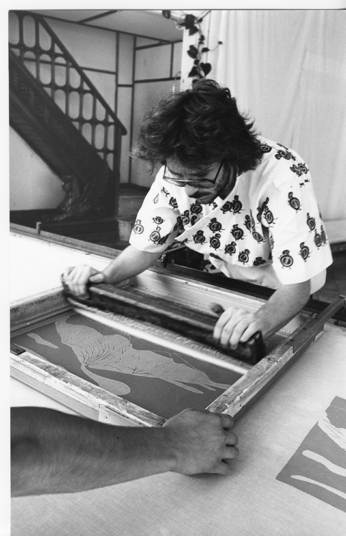 Anche per la preparazione dei primi telai da stampa seguimmo le indicazioni ricevute dai Tillet disegnando con la cera in positivo direttamente sul telaio e sovrapponendovi poi una vernice plastica. Lavando il telaio, quando la vernice si era seccata,con un getto di acqua calda, la cera si scioglieva e in quel punto la tela restava trasparente e quindi permeabile al colore.